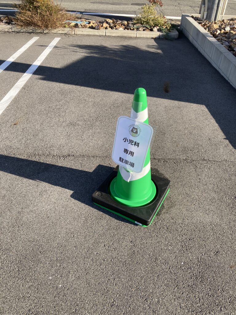 小児科患者さんが停められるように、スペースにコーンを設置してあります。