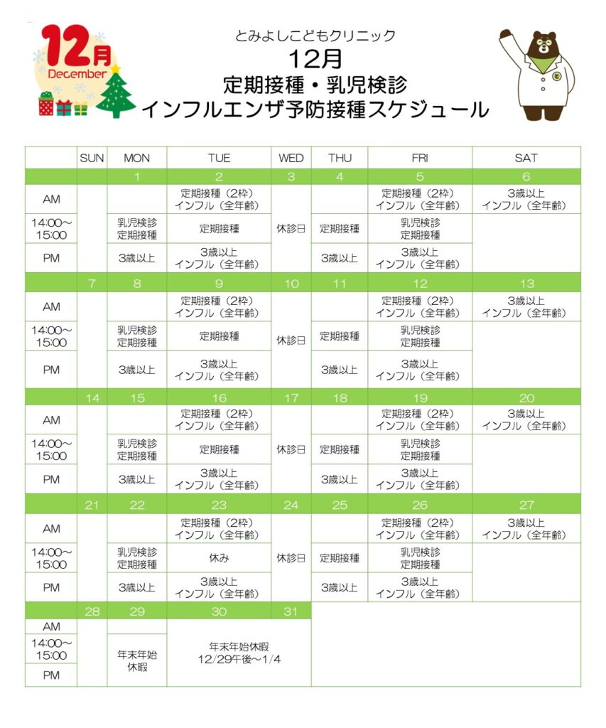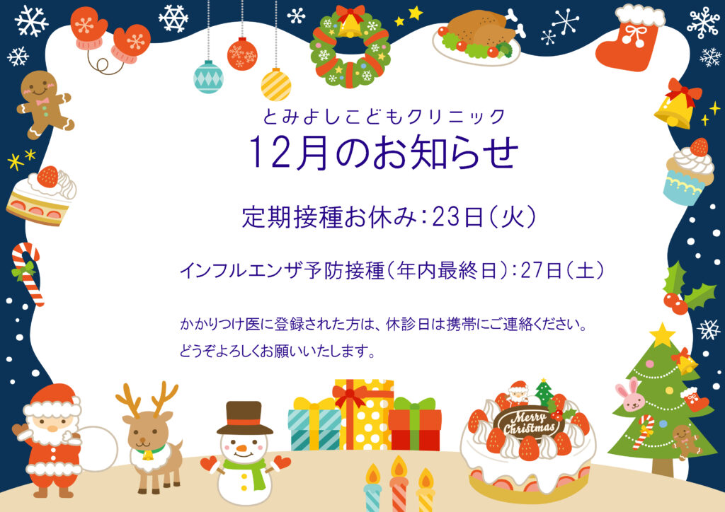 HOME お知らせ 12月のお知らせ、スケジュール 2025年10月30日 こんにちは、とみよしこどもクリニックです。 12月のお知らせとスケジュールをお送りします。 年末年始のお知らせは後日お送りします。 どうぞよろしくお願いいたします。 予約