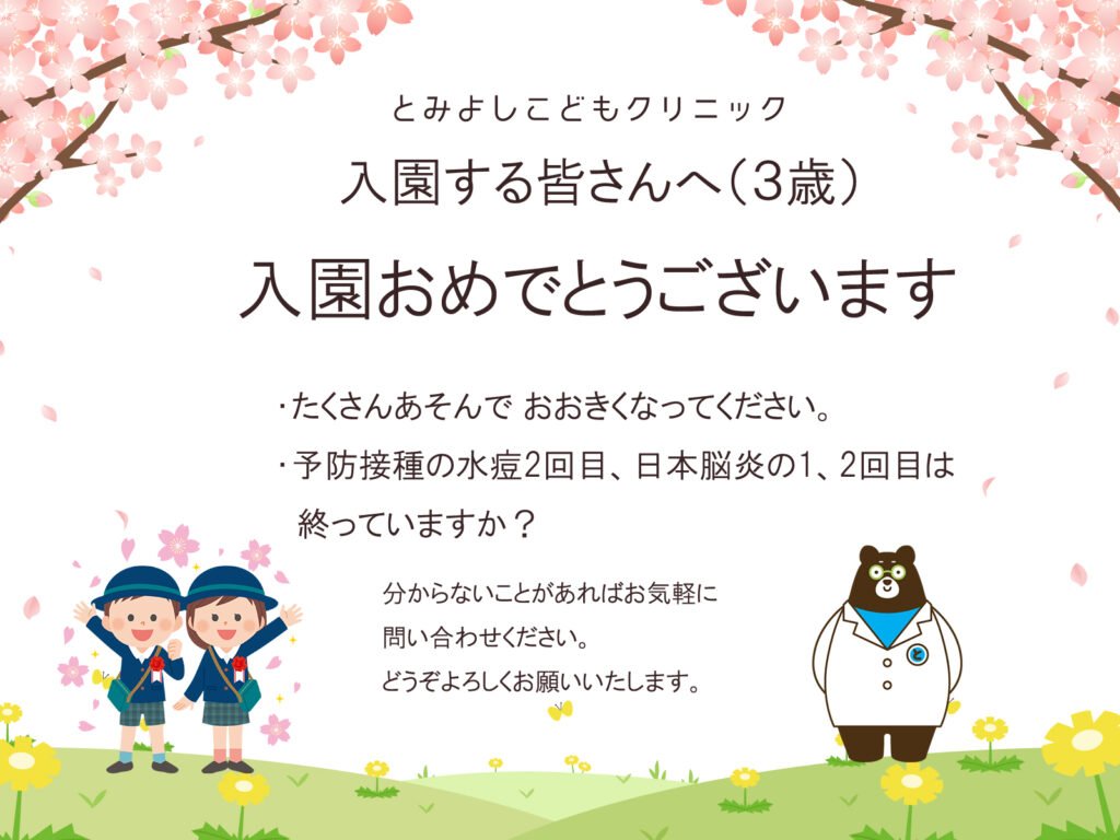3歳から打てる日本脳炎が、入園や冬場の風邪続きで始められてないケースが見受けられます。