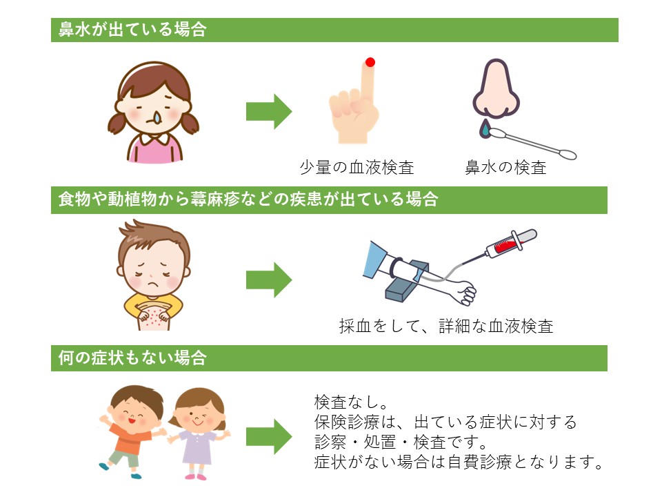 アレルギーの疾患(食物アレルギー、花粉症など)の「診断」と聞くと、アレルギー検査(血液検査)を行うものと思われがちですが、アレルギーの診断は基本的にアレルギー検査では行いません。